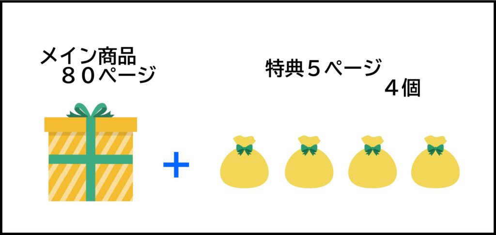 メイン内容がPDF80ページ相当で特典PDF5ページ相当の商品が4個、